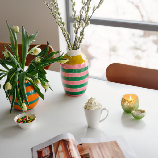 Merida-vasen i dolomit skapar glädje och stämning med sina färgglada handmålade ränder. Kombinera gärna flera vaser i olika storlekar för ett lekfu...