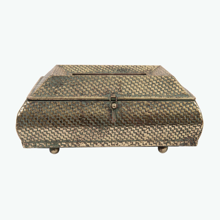 Läckert handgjort skrin i metall med antik guldfinish. Skrinet har spegel både utanpå och inuti. Secret skrin passar till små och stora skatter i sovrummet, i vardagsrummet eller i badrummet.