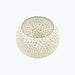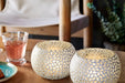 Stämningsfulla värmeljushållare dekorerade med vit glasmosaik.