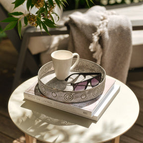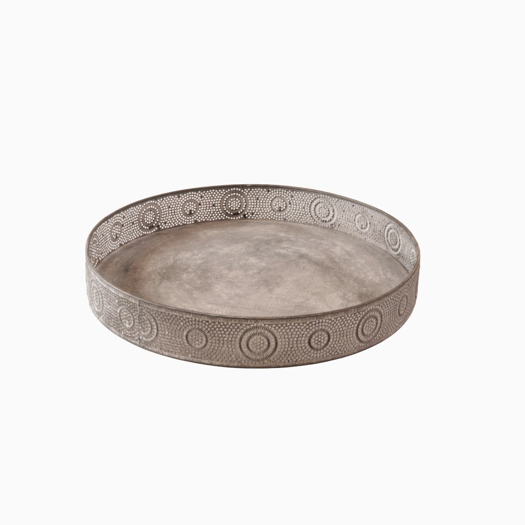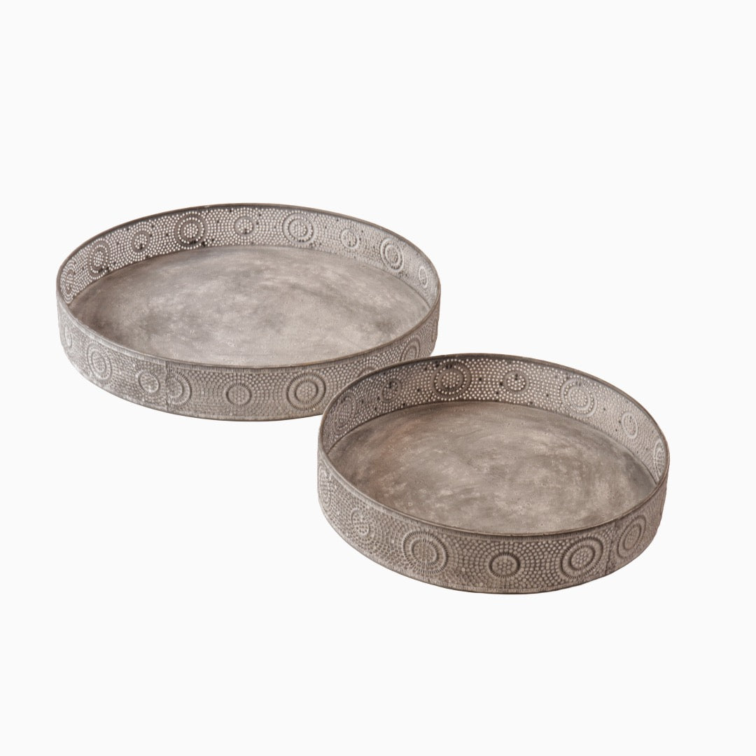 Dekorativa fat i järn, säljs i set om 2. Dessa charmiga fat är både mångsidiga och stiliga, perfekta som ljusfat eller som serveringsfat. Mått: L: 34x34x5 cm, S: 26x26x5 cm.