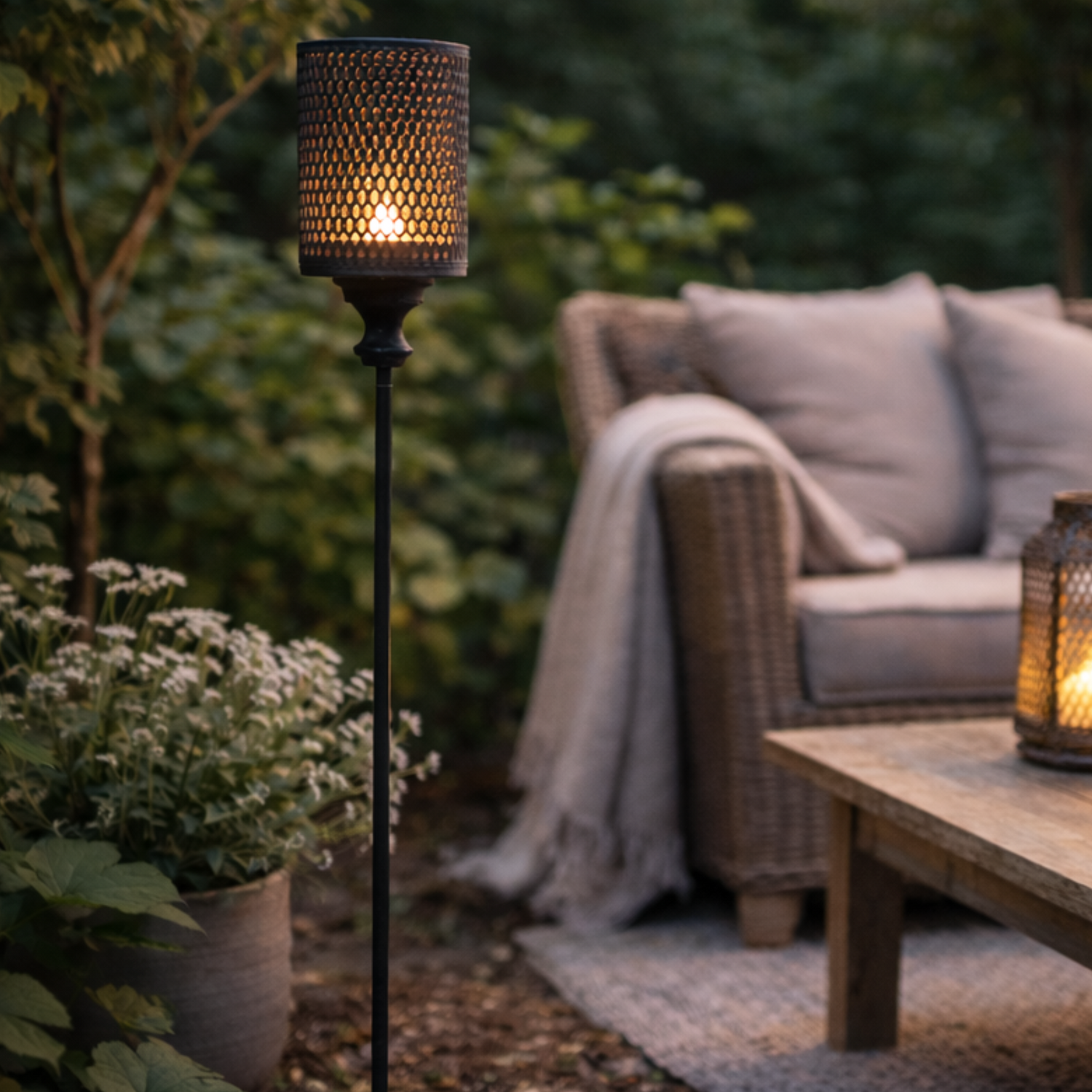 Trädgårdslyktan i järn Alassio har en antik finish och kan enkelt stickas i marken eller en kruka. Denna lykta skapar en varm och inbjudande atmosfär på din uteplats. Oavsett om det är för en avkopplande kväll eller en mysig sammankomst med vänner, kommer denna lykta att vara ett perfekt komplement. Lyktan passar väldigt bra till våra Candela Outdoor LED-lampor. Observera att lyktan måste föras in när det regnar för att skydda den mot rost. Mått: 12x101 cm