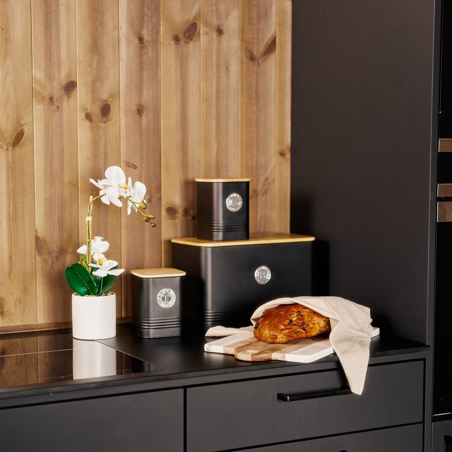 Denna brödlåda i metall med bambulock kombinerar det praktiska med det estetiska. Här håller sig brödet färskt längre samtidigt som du får ordning på köksbänken – utan att behöva gömma undan något i skåpet. Det stilrena uttrycket passar lika bra i ett modernt hem som i ett mer klassiskt kök. Bambulocket ger en varm kontrast till metallen och skapar en fin balans mellan det naturliga och det industriella. Vill du ha ett enhetligt uttryck? Matcha gärna med våra burkar för kaffe och te – så blir det både snyggt och genomtänkt i köket.