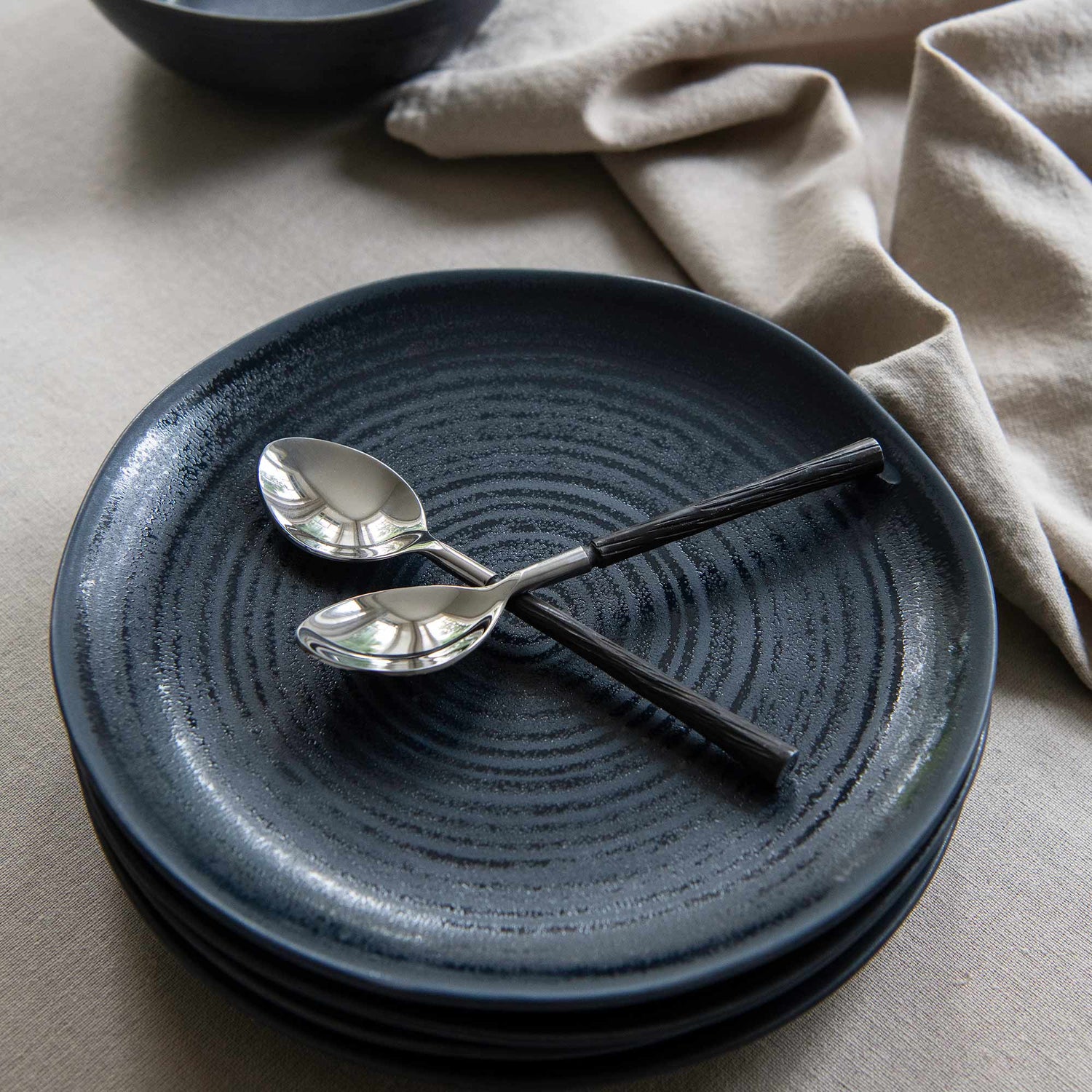 Midnight är en handgjord servis i stengods med en läcker, djupblå färg. Ytan har behandlats med en reaktiv glasyr, något som gör varje del unik. Assietten har ett dekorativt spiralmönster. Servisen tål både diskmaskin och mikrovågsugn.