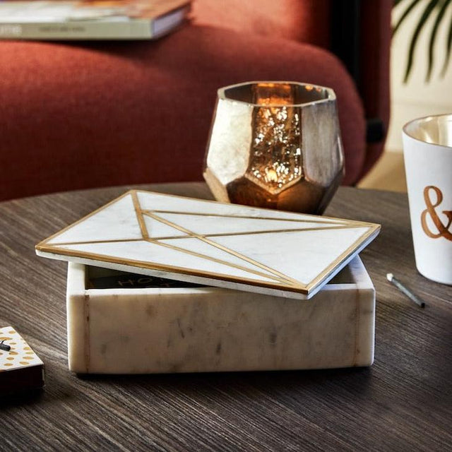 Läckert skrin i vit marmor med dekorativa mässingdetaljer. White Marble skrin är lika fint i sovrummet och i badrummet som i vardagsrummet.